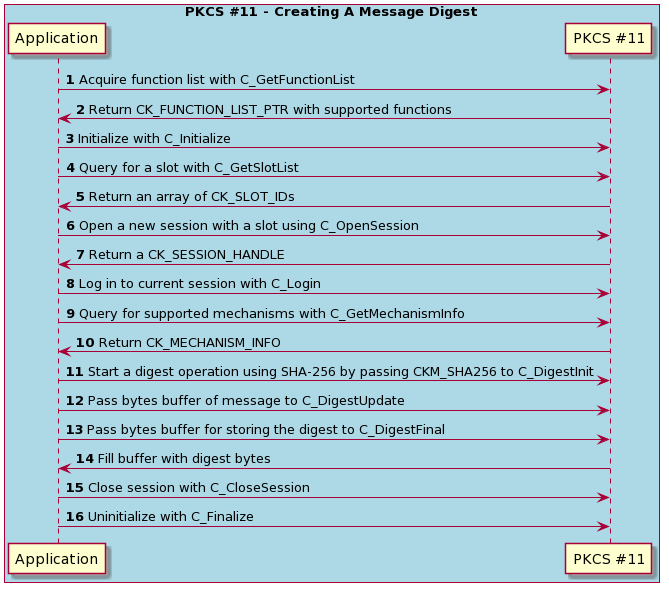 Sequence diagram illustrating how to create a message digest with PKCS #11.